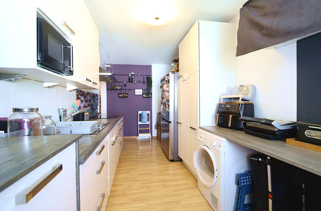 Beim Betreten der Wohnung empfängt Sie eine großzügige Diele mit Platz für Garderobe und weitere Möbel. Direkt daneben liegt die separate Küche mit einer im Kaufpreis enthaltenen Einbauküche in weißer Optik. Die zweizeilige Anordnung nutzt den Raum optimal: Auf beiden Seiten befinden sich Arbeitsflächen, eine Spüle und moderne Elektrogeräte. Tageslicht sorgt für eine angenehme Atmosphäre beim Kochen, während der direkte Bezug zum Essbereich kurze Wege beim Servieren ermöglicht.
