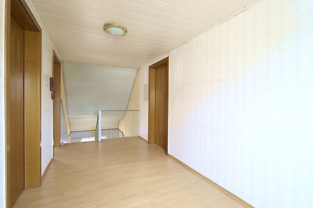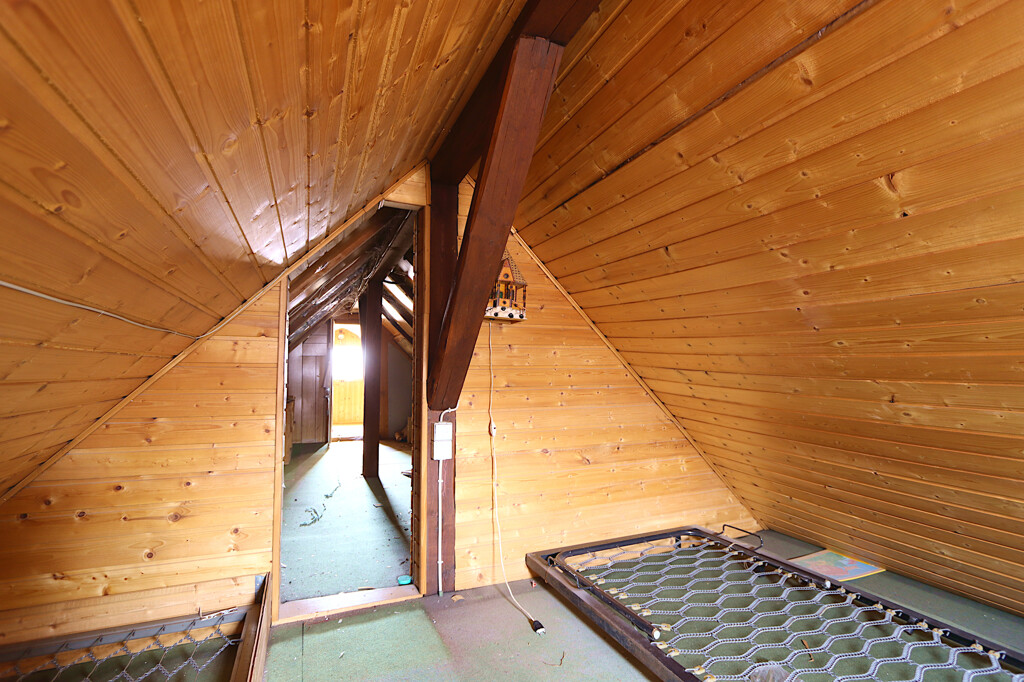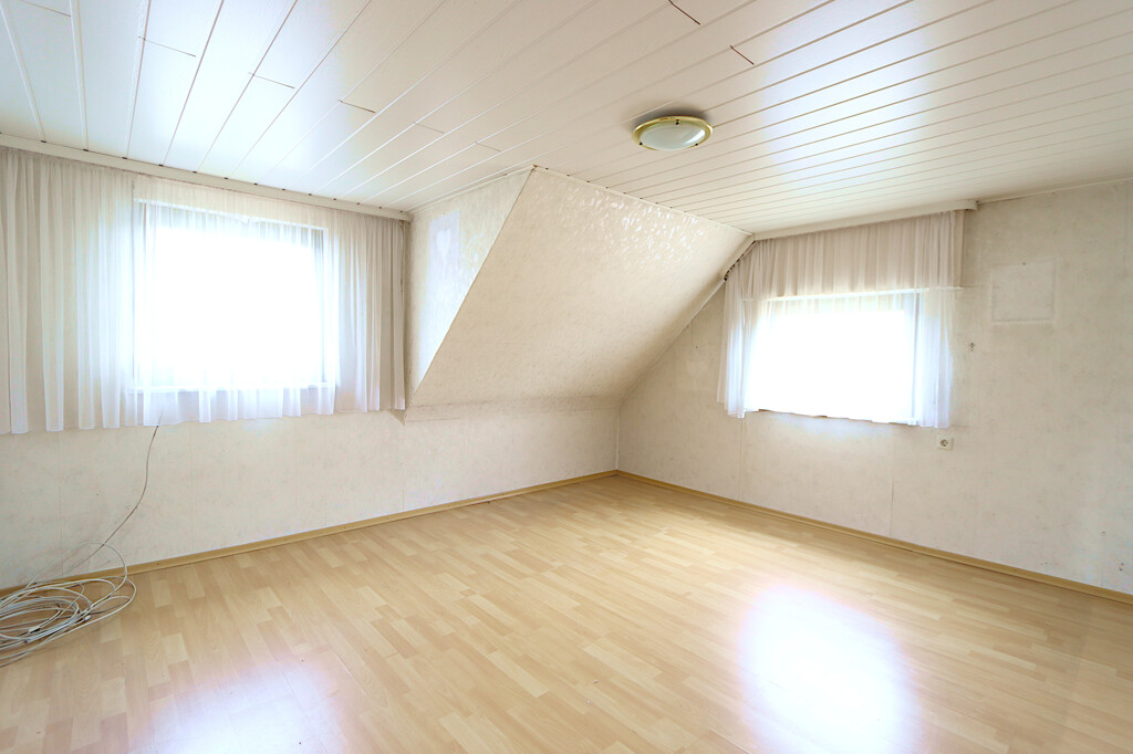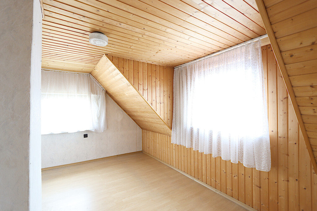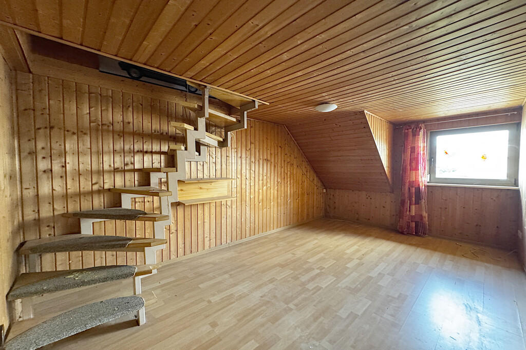 Eine Ebene weiter befindet sich das wohnlich ausgebaute Dachgeschoss. Es umfasst drei weitere Zimmer – zwei auf der rechten Seite sowie ein links gelegenes Zimmer. Dank der vorhandenen Gauben stehen Ihnen hier gut nutzbare, möblierbare Flächen zur Verfügung. Besonders praktisch: Das links gelegene Zimmer verfügt über einen direkten Zugang zu einem weiteren raumhoch gefliesten Tageslichtbad mit Badewanne, Handwaschbecken und WC. Von diesem Zimmer aus führt zudem eine Wendeltreppe auf den Dachboden, der reichlich zusätzlichen Stauraum für die ganze Familie bietet.