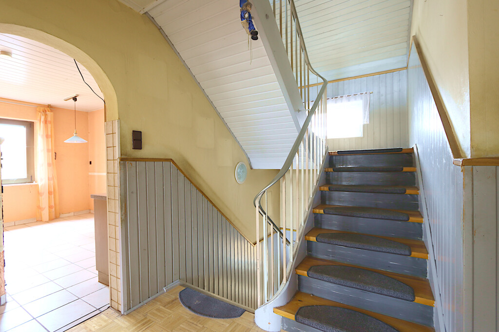 Über eine Holztreppe im Flur gelangen Sie in das Obergeschoss, das den zentralen Lebensmittelpunkt des Hauses bildet. Die abgetrennte Küche mit Einbauküche wird durch einen großzügigen Essbereich ergänzt, der zum Treffpunkt für Familie und Gäste wird. Von hier aus gelangen Sie auf einen überdachten Balkon, der ganzjährig einen geschützten Platz im Freien bietet. Eine Stahltreppe führt von dort direkt in den Hofbereich mit Schuppen auf der Rückseite des Hauses, der sich ideal zur Aufbewahrung von Geräten eignet.