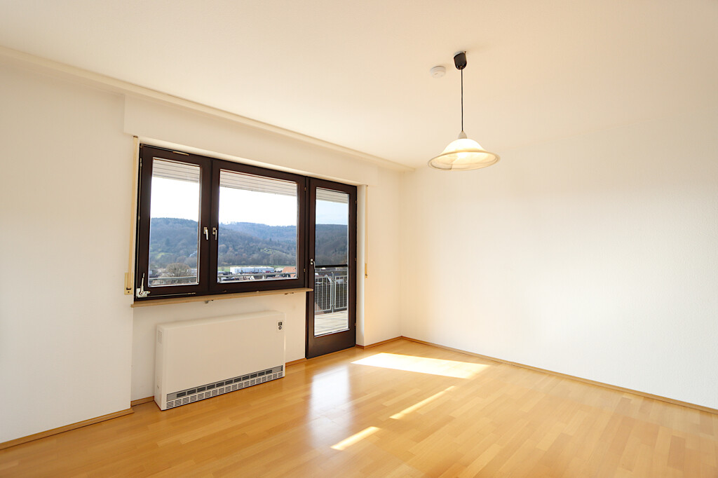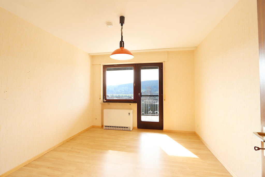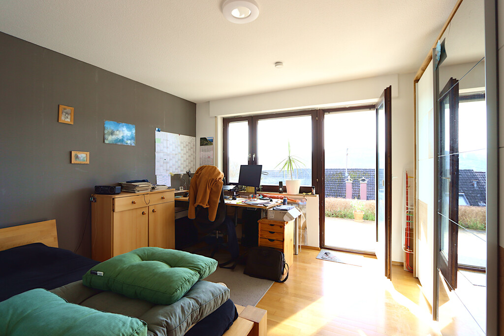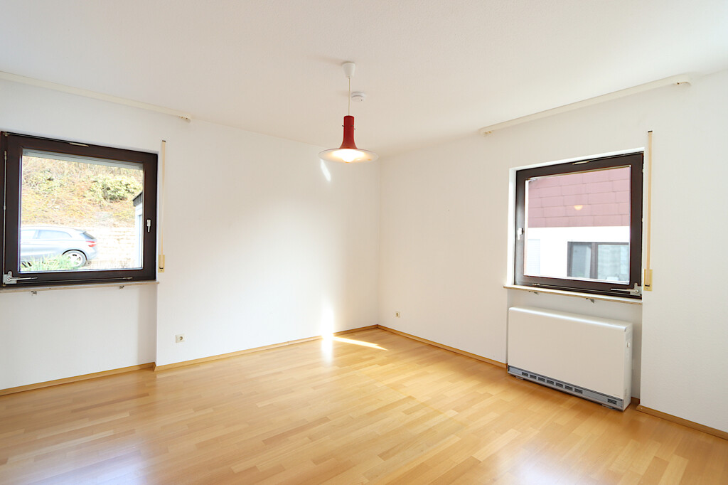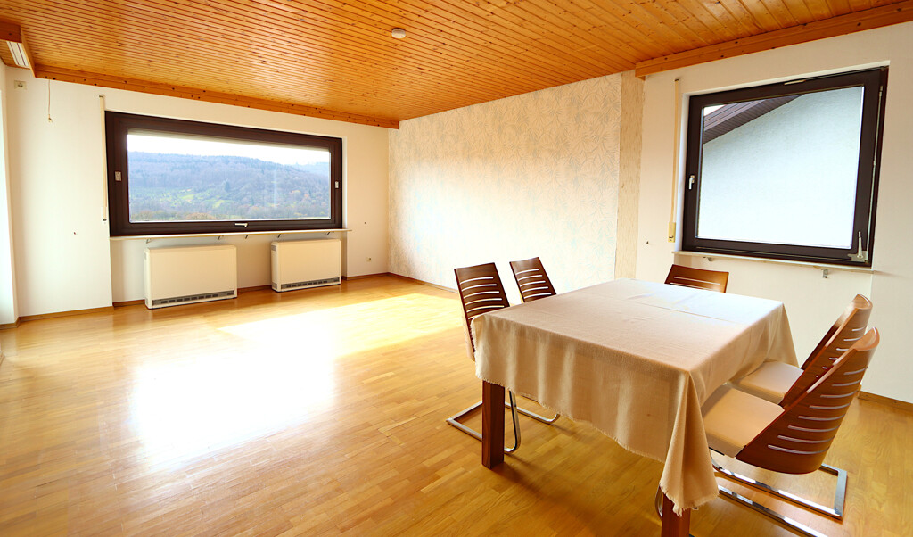 Die Hauptwohnung erstreckt sich über das Erdgeschoss und bietet mit insgesamt vier Zimmern viel Platz für Familien. Mittelpunkt der Wohnung ist der großzügige Wohn- und Essbereich, der durch große Fensterflächen viel Tageslicht erhält und eine freundliche Wohnatmosphäre schafft. Von hier aus gelangen Sie direkt auf einen der beiden Balkone, von dem aus sich ein schöner Ausblick über die Umgebung bietet.