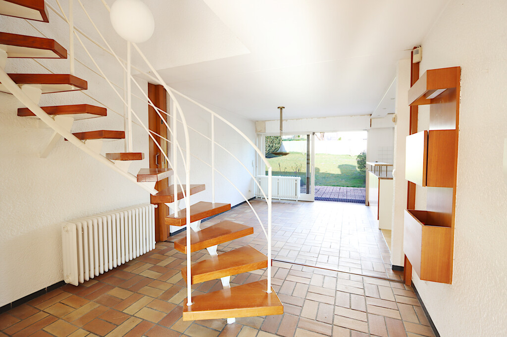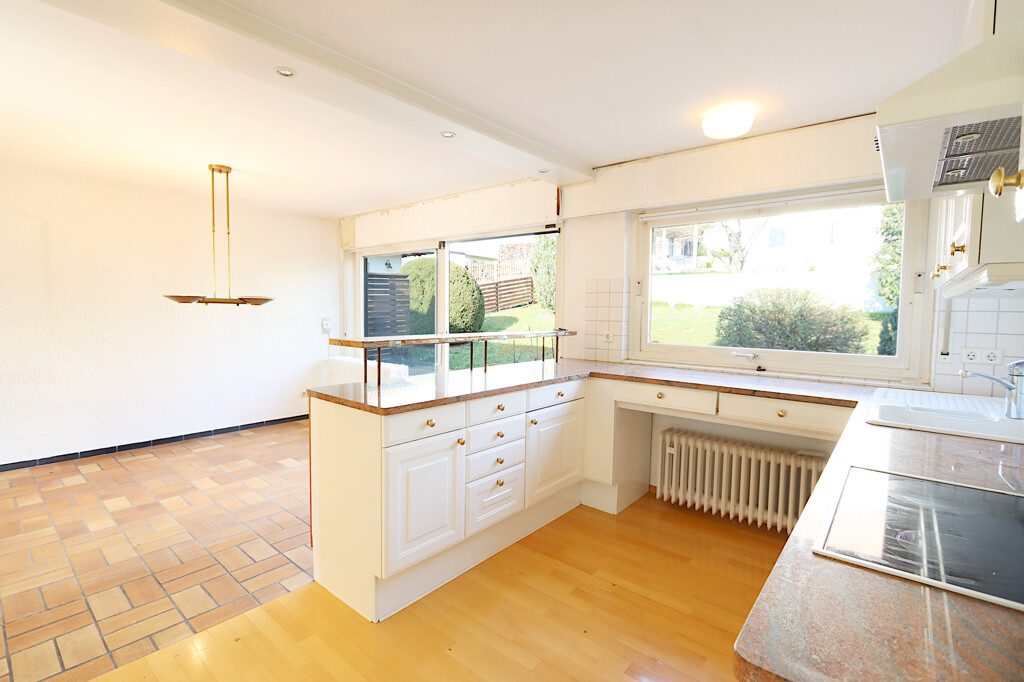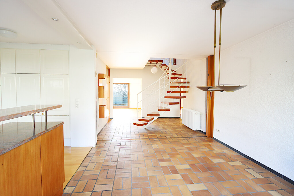 Bereits beim Betreten des Hauses wird die architektonische Qualität dieser Immobilie spürbar. Die charakteristische Split-Level-Bauweise schafft ein spannendes Spiel aus Ebenen und Blickachsen und verleiht dem Haus eine besondere Großzügigkeit. Die Treppenanlage mit gefliesten Stufen prägt den Eingangsbereich und unterstreicht den Stil der Bauzeit. Sie vermittelt Solidität und Struktur, während die versetzten Ebenen eine klare, aber zugleich lebendige Raumaufteilung entstehen lassen. Einen reizvollen Kontrast hierzu bildet die offene, elegant geschwungene Wendeltreppe aus Holz, die ins Dachgeschoss führt. Mit ihrer leichten, fast skulpturalen Gestaltung wirkt sie wie ein architektonisches Gestaltungselement und verbindet die Ebenen auf stilvolle Weise.
