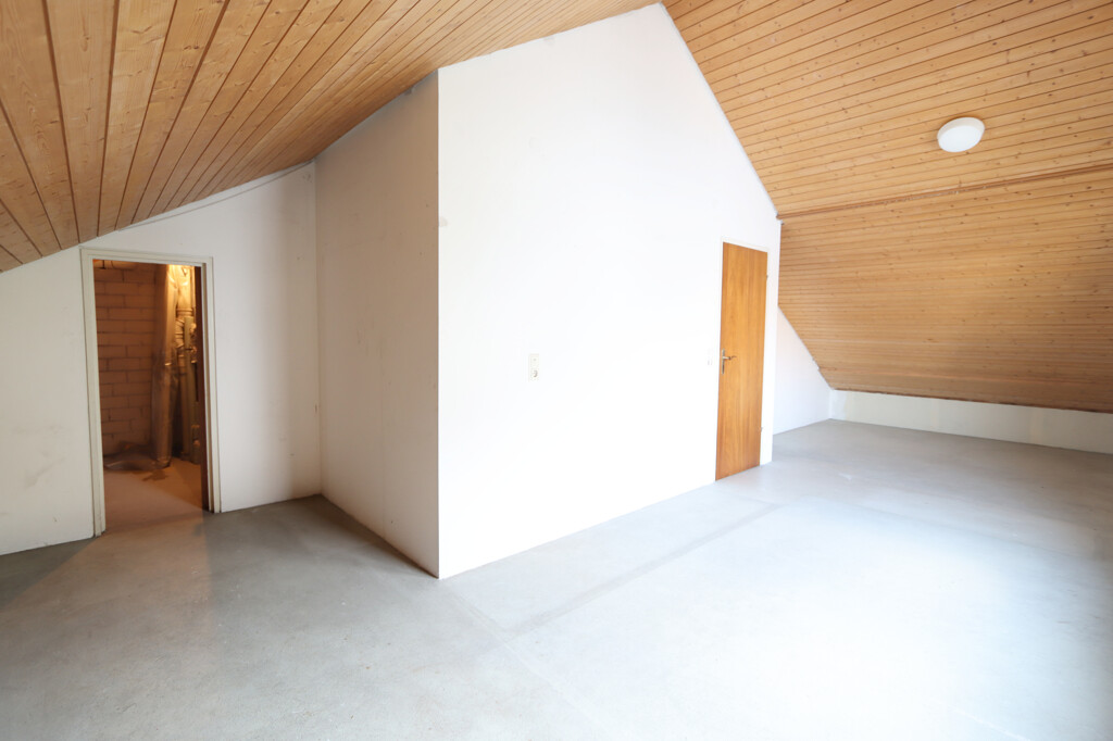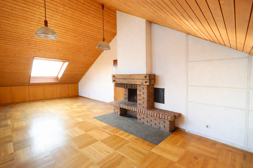 Ein besonderes Highlight befindet sich im Dachgeschoss: Das großzügige Kaminzimmer mit sichtbarer Holzdecke schafft eine warme, behagliche Atmosphäre und bietet einen idealen Rückzugsort innerhalb des Hauses. Dieser Bereich eignet sich hervorragend als Wohnlounge, Atelier oder privater Rückzugsraum und verleiht dem Objekt zusätzlichen Charme und Individualität.