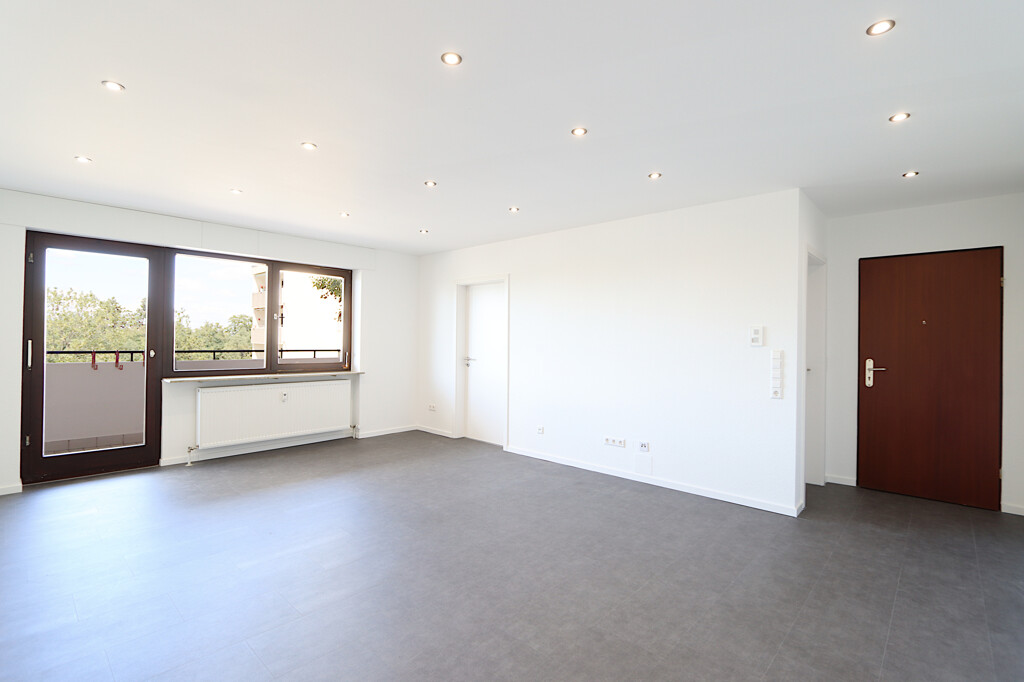 Der offen gestaltete Wohn‑/Schlafbereich ist das Highlight der Wohnung: Eine abgehängte Decke mit LED‑Deckenspots setzt stimmungsvolle Akzente, während eine große Fensterfront mit elektrischen Rollläden den direkten Zugang zum Balkon in Nordausrichtung eröffnet – ideal für den Morgenkaffee oder entspannte Abende.