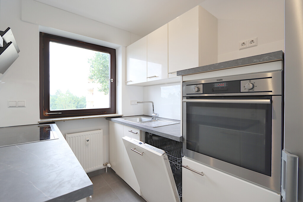 + Küche: Einbauküche mit E‑Geräten (Dunstabzugshaube, Kochfeld, Spülmaschine, Backofen auf Augenhöhe, Kühl‑/Gefrierkombi) (2025)