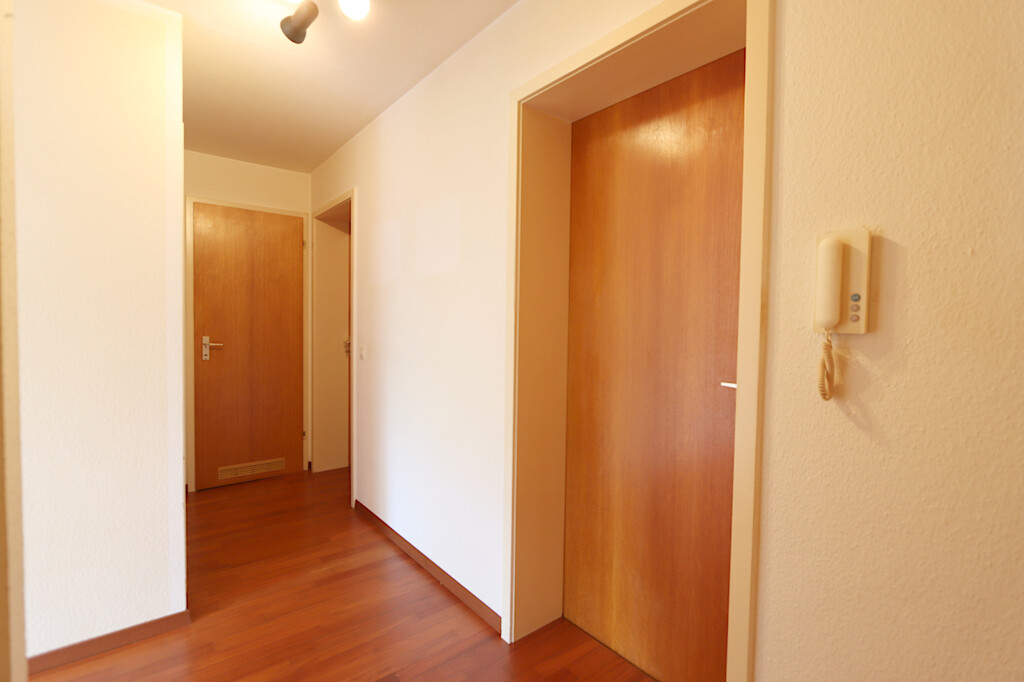 Schon beim Betreten empfängt Sie ein praktischer Eingangsbereich mit Garderobennische. Rechter Hand des Wohnungseingangs befinden sich die Zugänge zum Wohn- und Schlafzimmer.