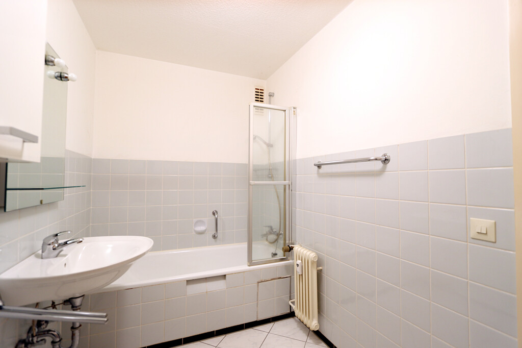 Das Schlafzimmer bietet ausreichend Platz für ein großes Bett und einen Kleiderschrank. Angrenzend, am Ende des Flurs, befindet sich das separate WC. Gleich daneben liegt das Badezimmer, funktional ausgestattet mit einer Badewanne und einem Handwaschbecken.