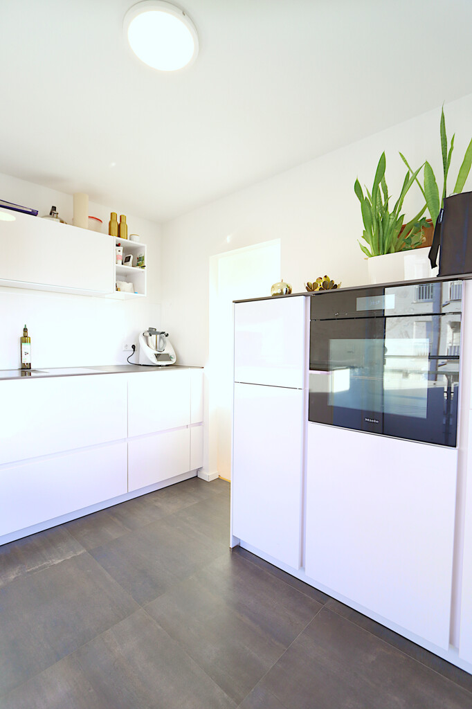 Die moderne Einbauküche mit hochwertigen Marken-E-Geräten fügt sich nahtlos in das Gesamtkonzept ein. Klare Linien, viel Arbeitsfläche, ein zeitloses Design und technischen Feinheiten, wie einem Backofen auf Augenhöhe, machen sie zu einem funktionalen wie ästhetischen Mittelpunkt des täglichen Lebens. Besonders reizvoll ist der direkte Zugang zum zweiten Balkon, der den Küchenbereich zusätzlich aufwertet und ideal für ein Frühstück im Freien, Urban Gardening oder entspannte Pausen ist.