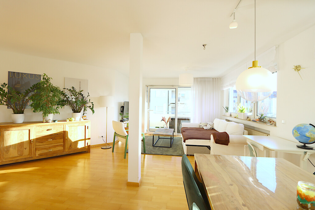 Der große Wohn- und Essbereich ist das Herzstück der Wohnung – lichtdurchflutet, warm und mit weiten Fensterflächen, die den Raum in ein angenehmes, natürliches Licht tauchen. Die großzügige Dimensionierung ermöglicht eine vielfältige Möblierung und schafft einen Ort, an dem sich Alltag, Erholung und gesellige Momente wunderbar vereinen lassen. Von hier aus gelangt man auf den überdachten Balkon, der an warmen Tagen zur Erweiterung des Wohnraums wird und eine geschützte Umgebung für erholsame Stunden bietet.