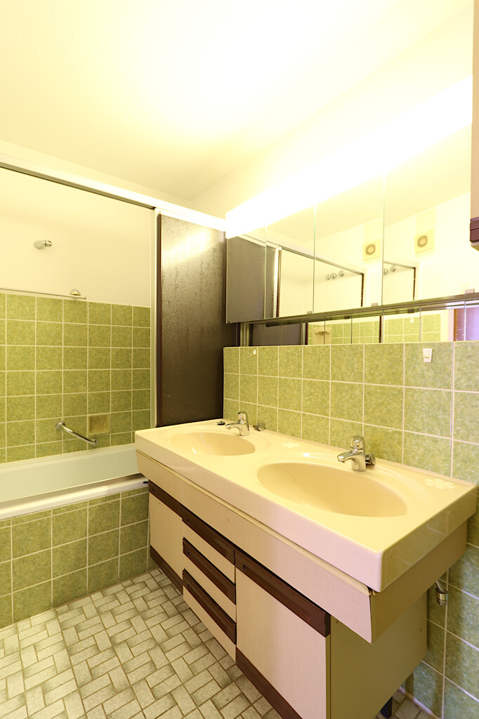 Das Badezimmer ist klassisch ausgestattet und verfügt über eine Badewanne sowie einen Waschtisch mit zwei Handwaschbecken. Ergänzt wird das Raumangebot durch ein separates WC, was den Komfort im Alltag zusätzlich erhöht. Ein praktischer Abstellraum innerhalb der Wohnung sorgt für wertvollen Stauraum und rundet das durchdachte Raumkonzept ab.