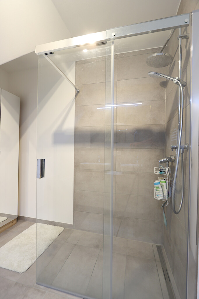 Ein separates Schlafzimmer, ein geschmackvoll gefliestes Badezimmer mit bodengleicher Walk-in-Dusche sowie ein separates WC ergänzen diese Ebene. Praktisch ist auch das großzügige Homeoffice mit integriertem Abstellraum, das sich ideal für das Arbeiten von zu Hause oder als Hobbyraum eignet.