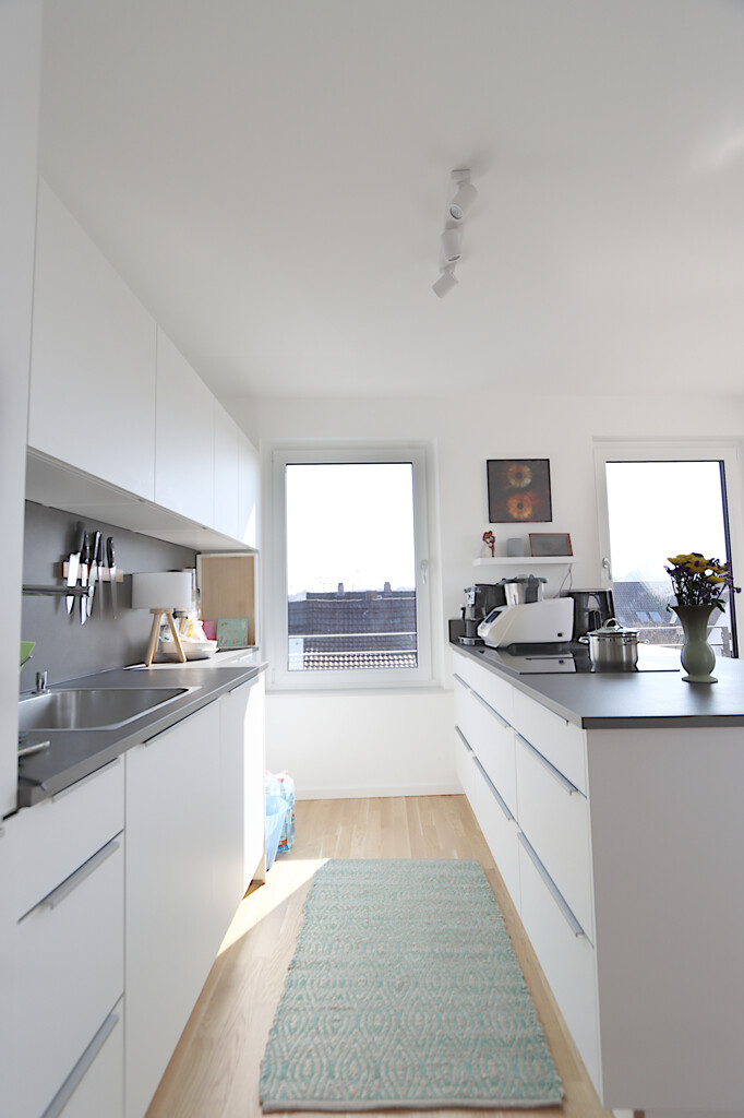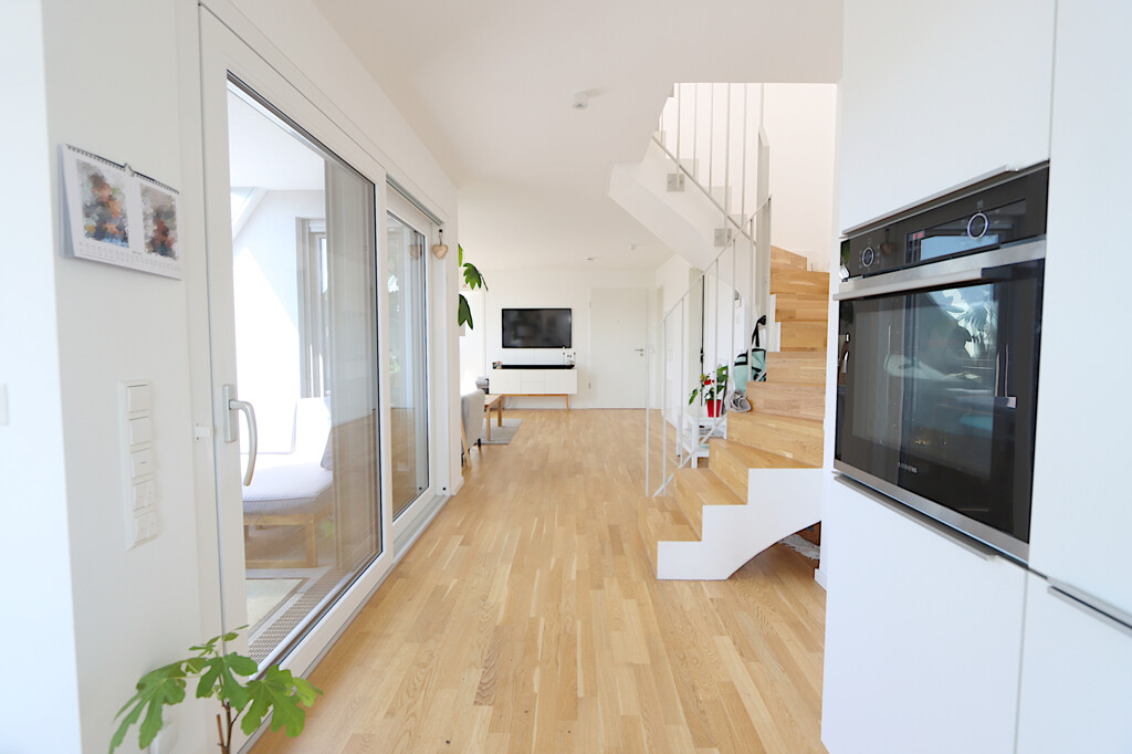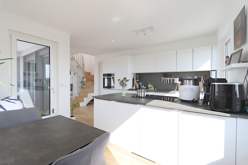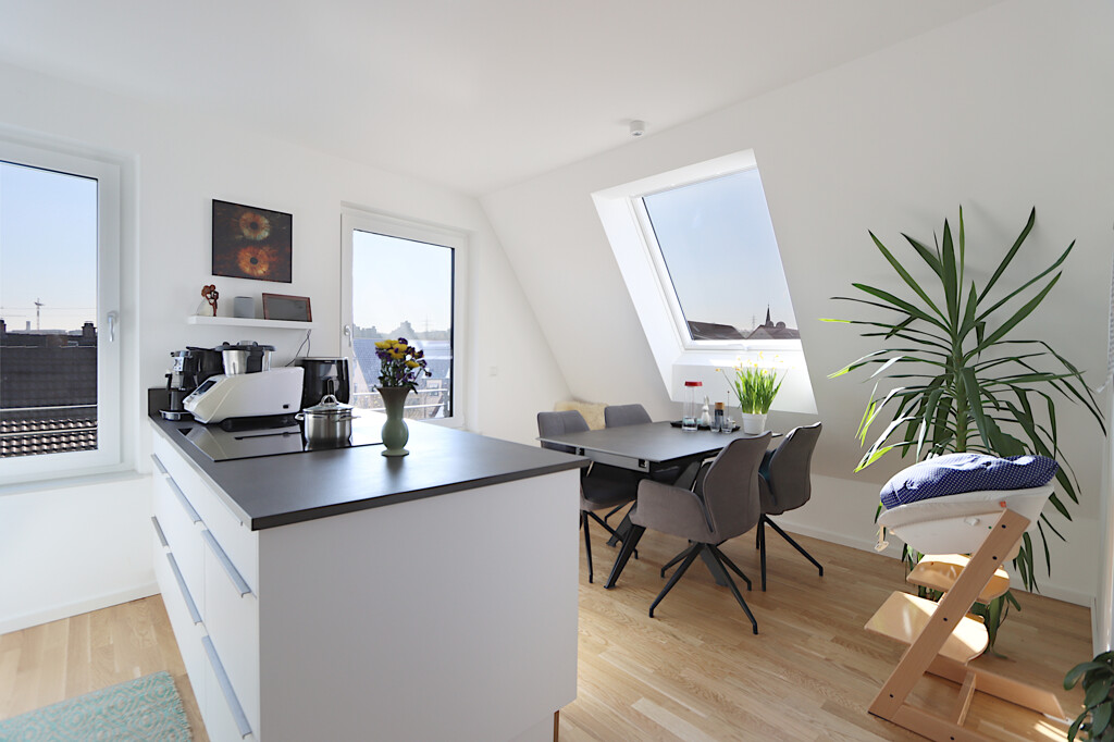 Im unteren Geschoss der Wohnung befindet sich der zentrale Wohn-, Ess- und Kochbereich, der offen gestaltet ist und durch die zahlreichen Dachflächenfenster und Fensterfronten im Loggia-Bereich mit Tageslicht hell erleuchtet wird. Die moderne Einbauküche fügt sich harmonisch in das Raumkonzept ein – funktional und stilvoll zugleich für ein klassisch-modernes Gesamtbild. Ein Backofen auf Augenhöhe, ein induktives Kochfeld mit integriertem Abzugssystem sowie hochwertige Elektrogeräte bieten hohen Kochkomfort. Die klare Linienführung und die praktische Kochinsel mit Thekenfunktion machen die Küche zu einem zentralen Treffpunkt für Familie und Gäste.