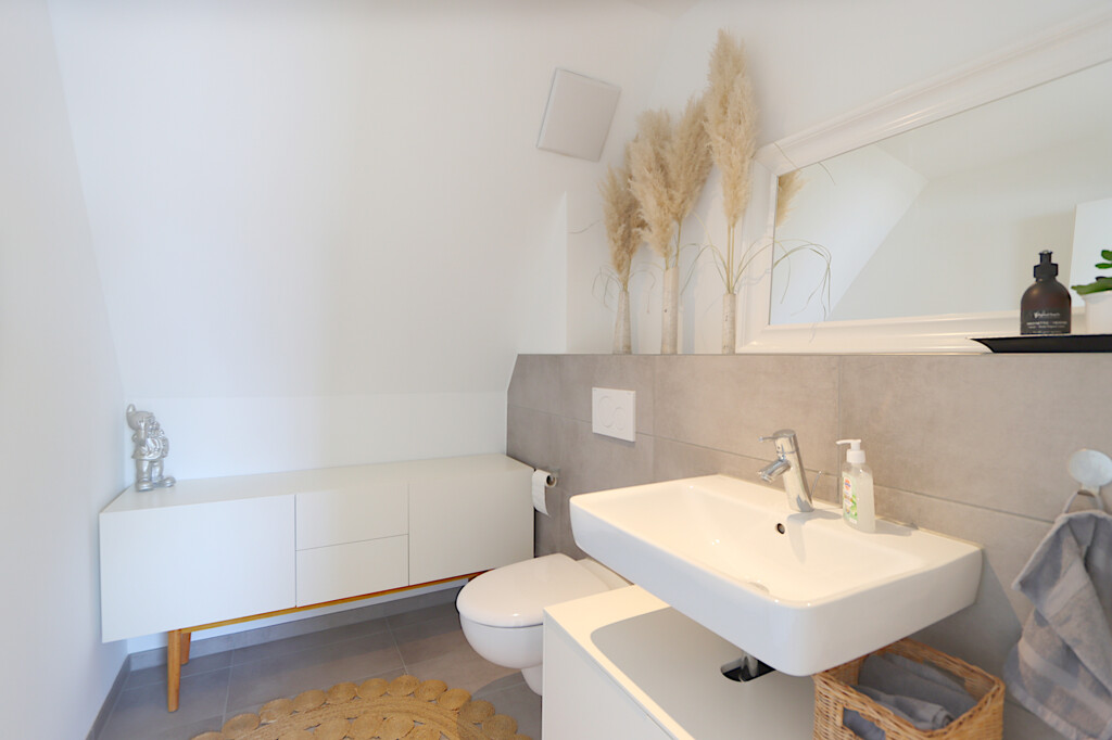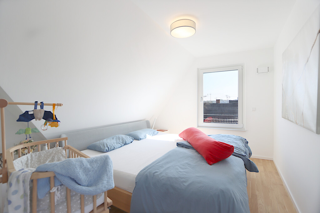 Eine elegante Treppe führt ins Dachgeschoss. Zwei weitere Zimmer stehen hier als Kinder-, Gäste- oder Rückzugsräume zur Verfügung. Ein zweites Duschbad auf dieser Ebene ergänzt das komfortable Raumangebot ideal.