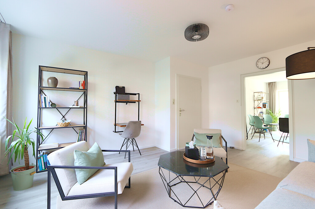 Geradeaus betreten Sie den ersten der drei Räume. Durch die großen Fenster fällt reichlich Tageslicht ein, sodass eine helle und einladende Atmosphäre entsteht. Der moderne Laminatboden, der sich gleichmäßig durch die gesamte Fläche zieht, verleiht dem Büro einen gepflegten und zeitgemäßen Eindruck. Dieses Zimmer lässt sich flexibel einrichten und eignet sich sowohl als repräsentativer Besprechungsraum als auch für vielfältige andere Zwecke, die sich an Ihren individuellen Bedürfnissen orientieren.