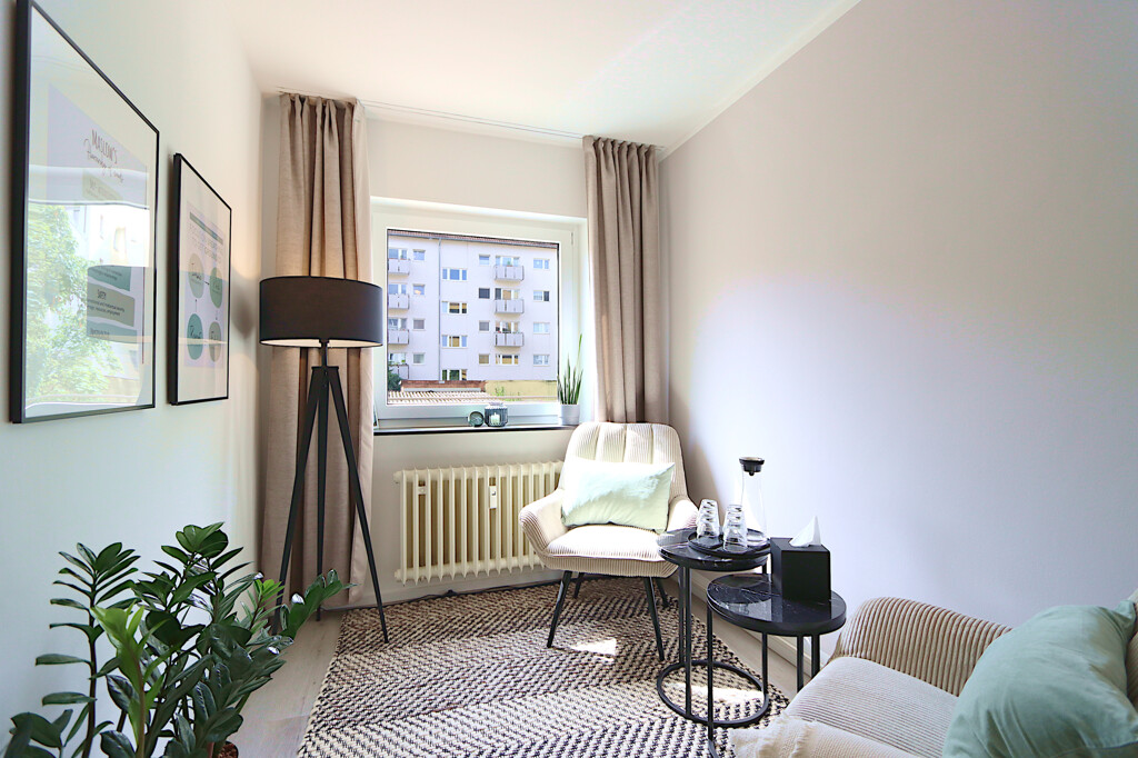 Über ein gepflegtes Treppenhaus gelangen Sie im ersten Obergeschoss zum Eingang der Büros. Beim Betreten empfängt Sie eine praktische Diele, die sich hervorragend als Warte- oder Ankunftsbereich eignet. Hier lassen sich Sitzgelegenheiten sowie eine Garderobe stilvoll unterbringen, sodass sich Ihre Kunden von Anfang an willkommen fühlen. Zur rechten Seite befindet sich zudem der direkte Zugang zu den Sanitärbereichen.