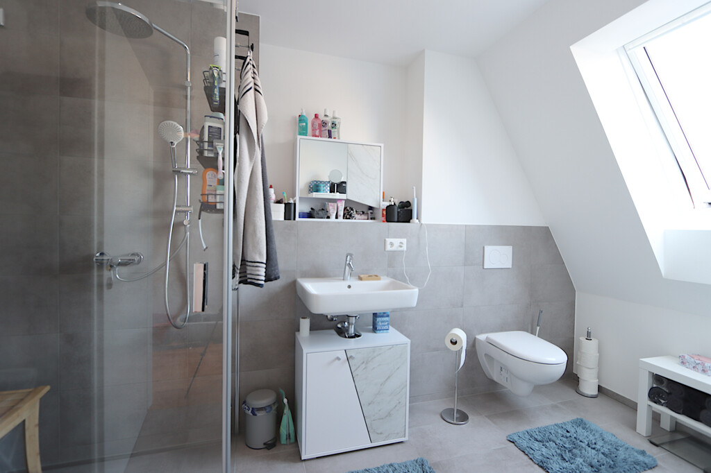 Das Tageslichtbad ist mit einer bodentiefen Glasdusche, modernen Fliesen und hochwertiger Sanitärkeramik ausgestattet – elegant und pflegeleicht zugleich. Ein separates Gäste-WC unterstreicht die Alltagstauglichkeit der Wohnung.