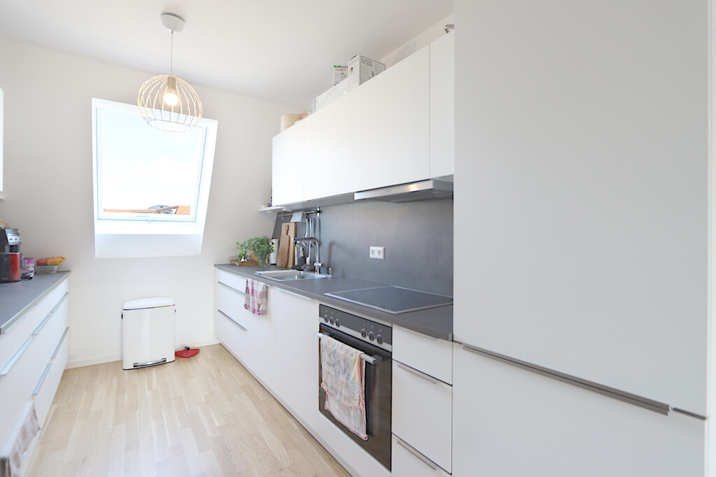Die moderne Einbauküche ist mit energieeffizienten Elektrogeräten ausgestattet und fügt sich mit ihren eleganten Fronten und der durchdachten Gestaltung harmonisch in das Gesamtbild der Wohnung ein. Besonders praktisch: Direkt angrenzend befindet sich ein separater Abstellraum, der ideal als Vorratskammer oder für Haushaltsgeräte genutzt werden kann. So bleibt die Küche stets aufgeräumt und übersichtlich, während wichtige Dinge schnell griffbereit sind.