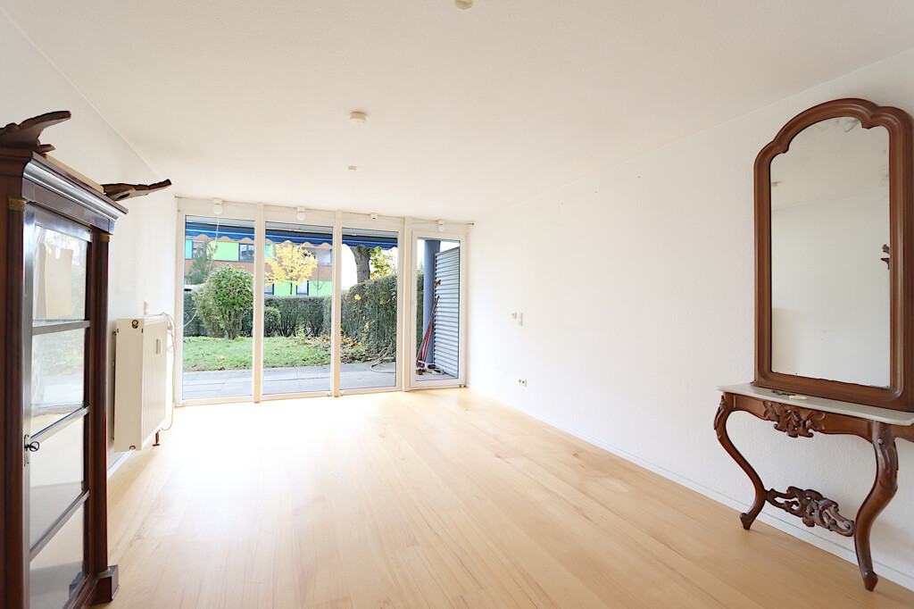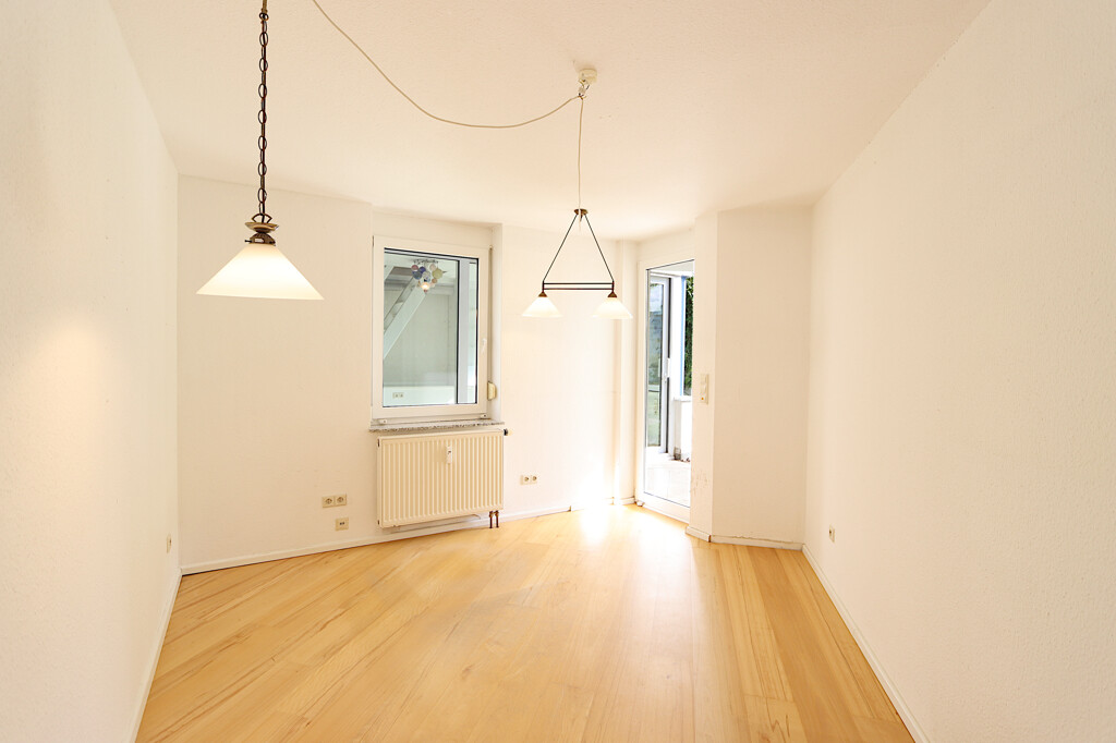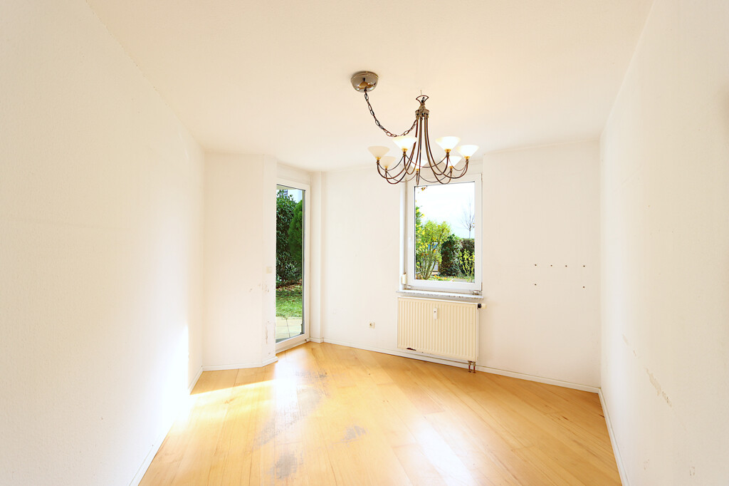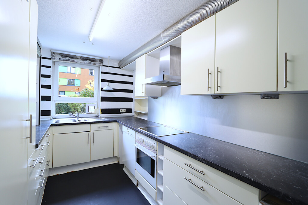 Im Wohn- und Essbereich öffnen bodentiefe Fenster den Blick ins Grüne. Der weitläufige Lichteinfall schafft eine freundliche, einladende Wohnatmosphäre. Die separate Küche ist mit einer hellen, doppelseitigen Einbauküche ausgestattet und bietet viel Arbeitsfläche und Stauraum. Durch den Blick ins Grüne entsteht hier ein Ort, an dem sich Kochen und Genießen wunderbar verbinden lassen.