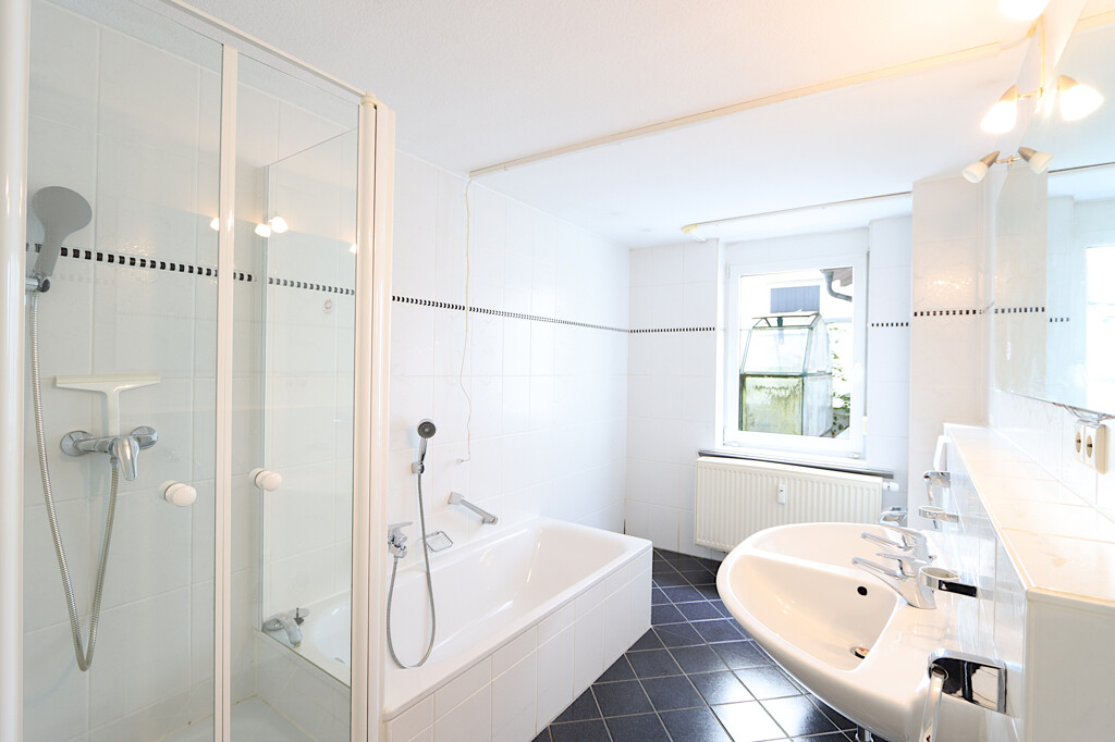 + Badezimmer: Dusche, Badewanne, Doppelhandwaschbecken, WC
